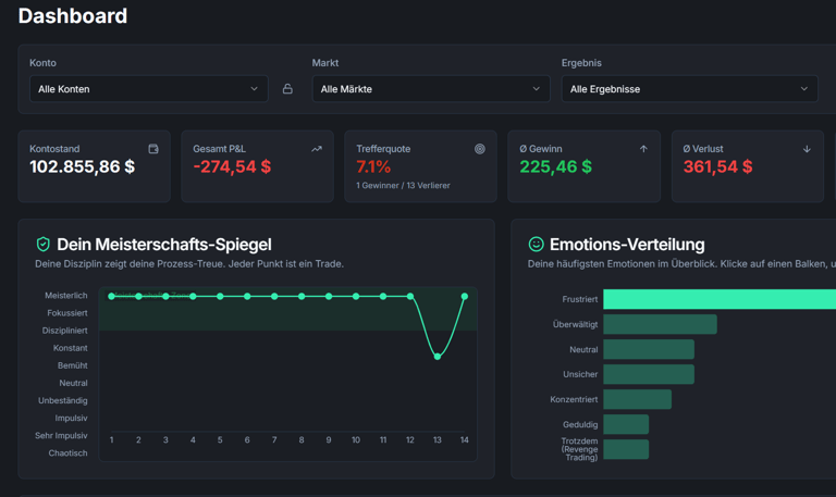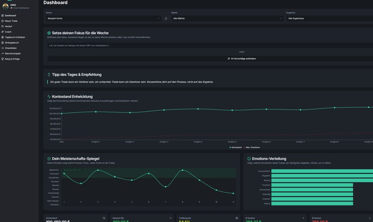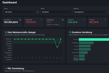 Verfolge nicht nur deine P&L, sondern auch deine psychologische Entwicklung. Sieh, wie sich deine Disziplin verbessert und wie du deine eigenen Bestleistungen übertriffst.
